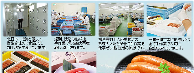 スカ地方の世界一といえるハイレベルな原卵、採取、処理法に目をつけ、更にそこでもっともたらこが成熟する1~2月下旬に獲れたものだけを使用。